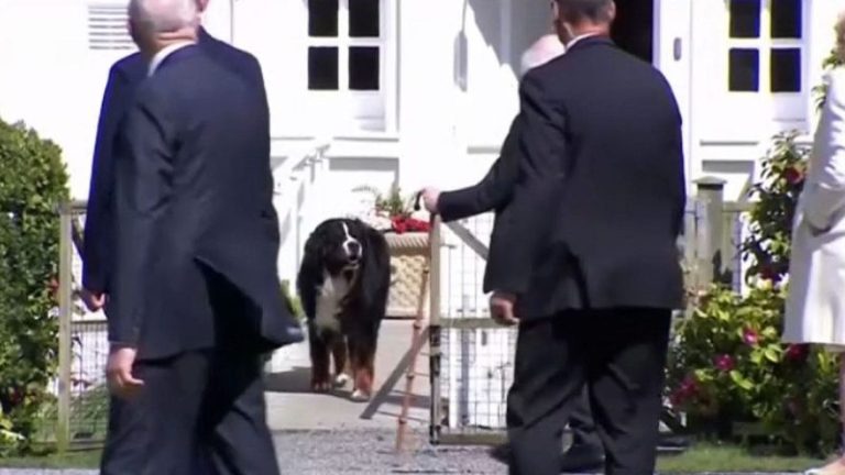 As the two leaders strolled around Higgins’ residence, they approached the president’s furry friend, who appeared excited until Biden neared.