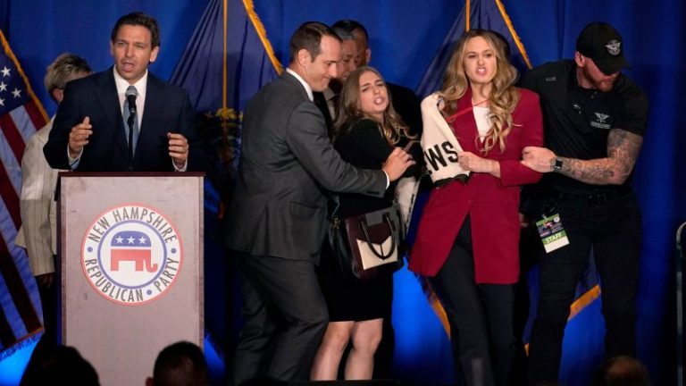 MANCHESTER, N.H. – Gov. Ron DeSantis of Florida’s address to the New Hampshire GOP’s annual fundraising dinner on Friday was momentarily interrupted a couple of minutes into his speech by a handful of female protesters.