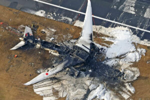 Wreckage from the planes remained scattered around the runway on Thursday as several officials, some wearing masks, gloves and hard hats, surveyed the debris, footage on public broadcaster NHK showed. A Coast Guard official on Wednesday said they had recovered a voice recorder from the Coast Guard plane.