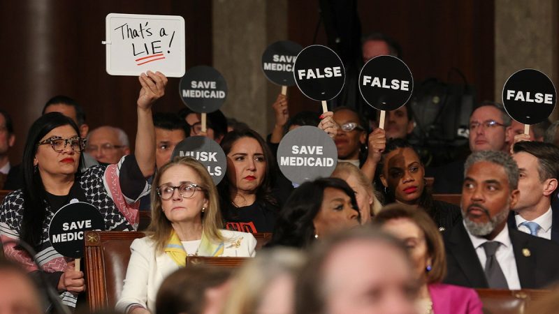 In addition to the signs and lack of cheers, multiple Democrats walked out of the address, some wearing political shirts. One of them was Rep. Maxwell Frost, D-Fl., who wore a shirt with ‘No kings live here’ written on the back. Others held up paddles throughout the speech that were reminiscent of the one Tlaib used to protest Israeli Prime Minister Benjamin Netanyahu. Messages on the paddles included ‘Musk steals,’ ‘Save Medicaid’ and ‘False.’